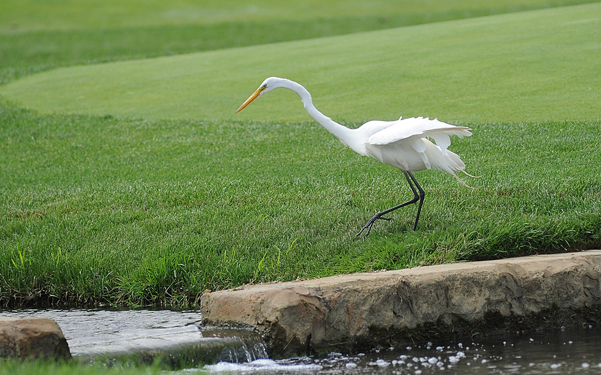 A crane spent some time looking for lunch around the 14th green.