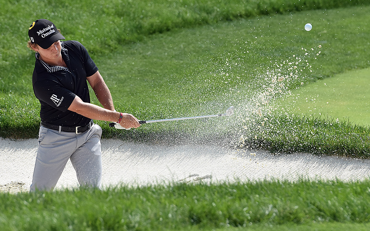 Bud Cauley chips out of the bunker on 17.