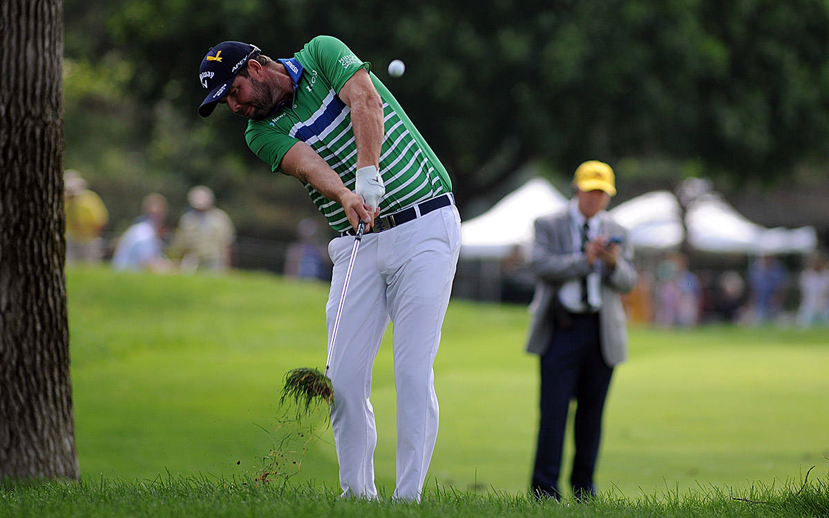 Marc Leishman hits his second shot from the rough on the way to a par at 17.