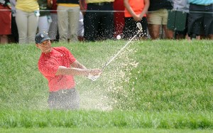 Tiger Woods chips out of a bunker on No. 13.